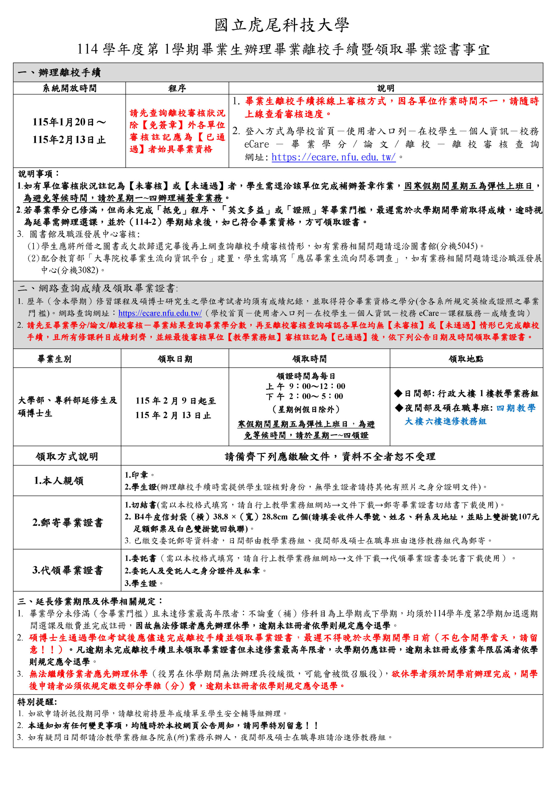【教務處教學組】114學年度第1學期畢業生辦理畢業離校手續暨領取畢業證書注意事項